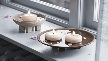 Plovoucí svíčky jsou umístěny v miskách a miskách s vodou. Dává jednoduchou atmosféru - uvnitř i venku.