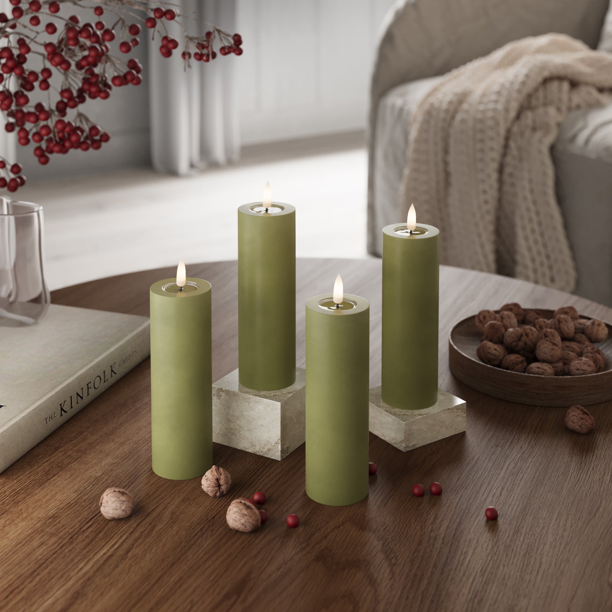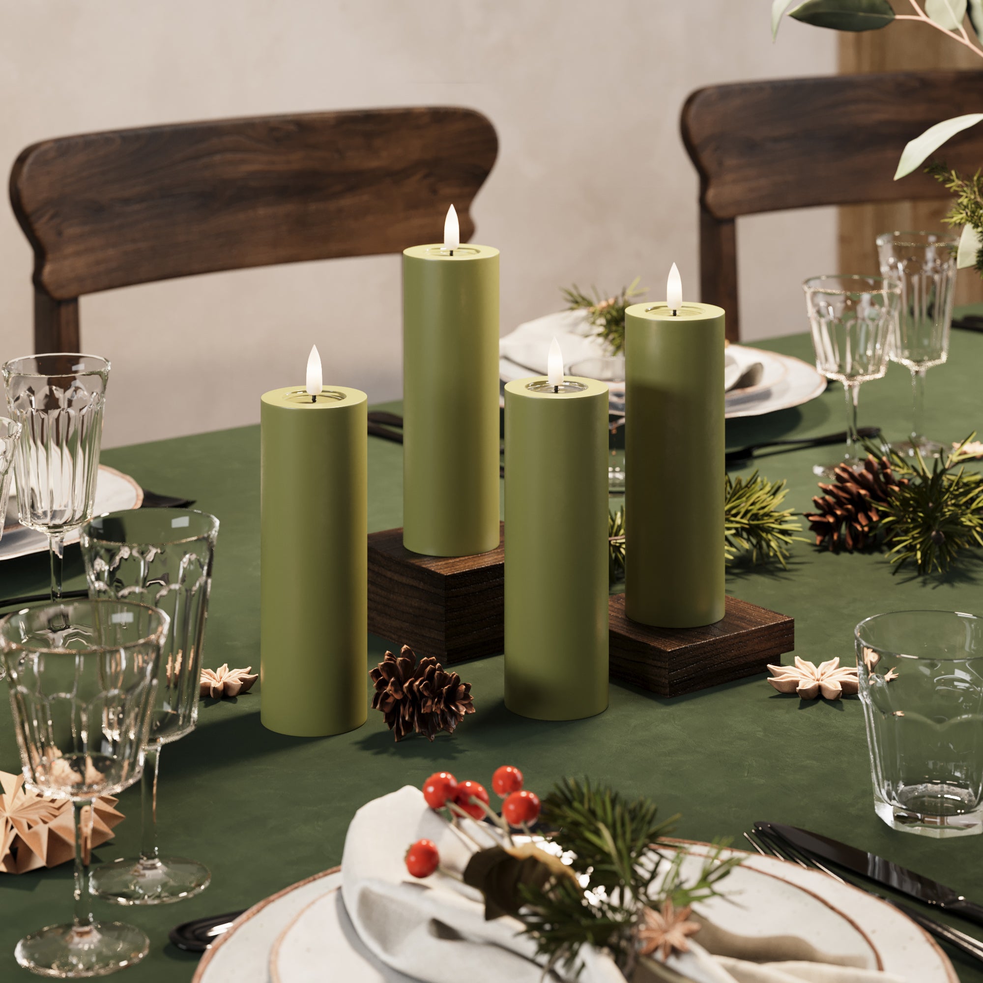 LED-Blockkerzen Ø 5 x 15 cm Olivgrün – 4 Stück