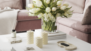 For et roligt helhedsindtryk kan du samle lysene på et fad og variere højderne, mens farverne holdes i samme palette.