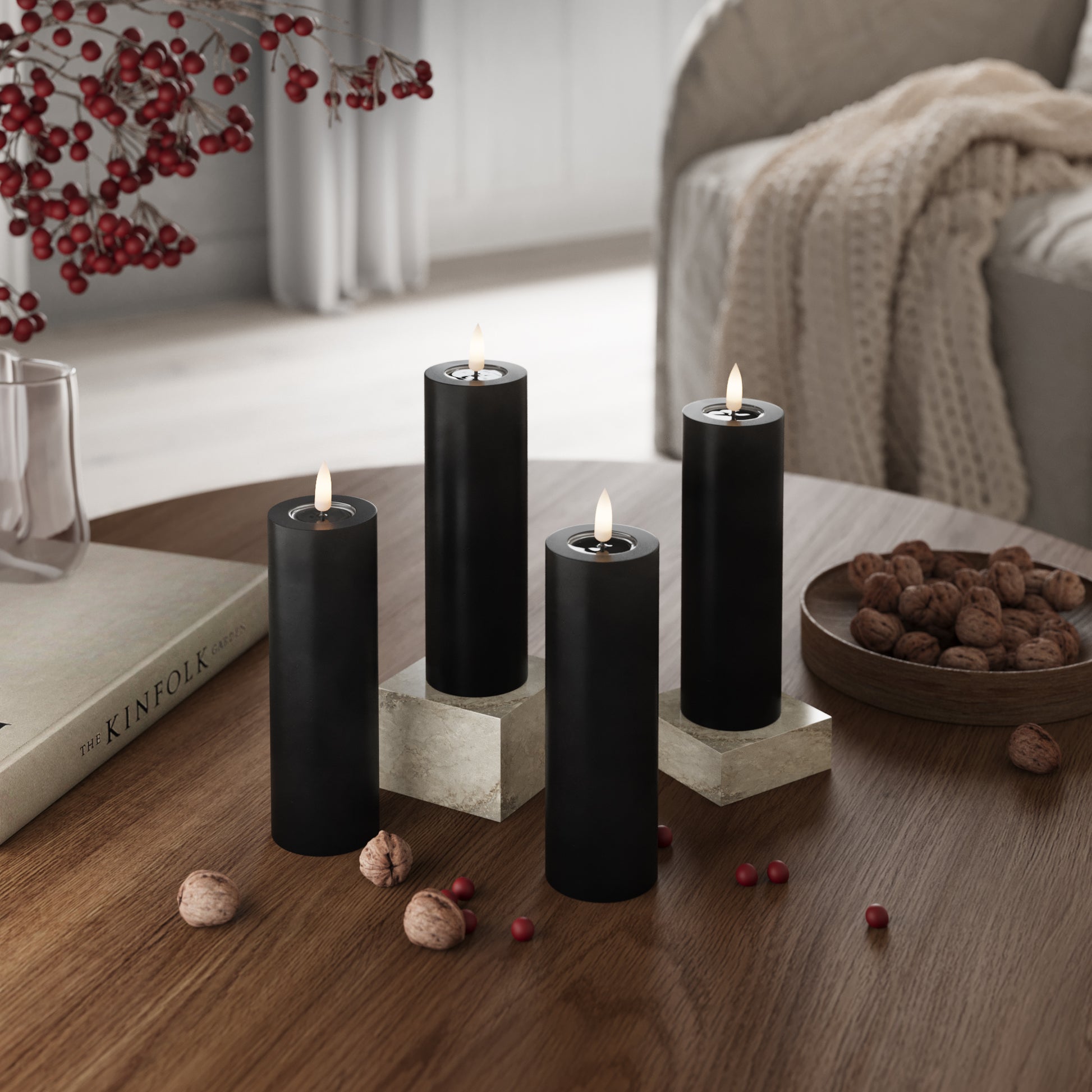 Bloklys er perfekte til dekorationer. Saml dem på et fad, i en lanterne eller i vindueskarmen for en rolig stemning.
